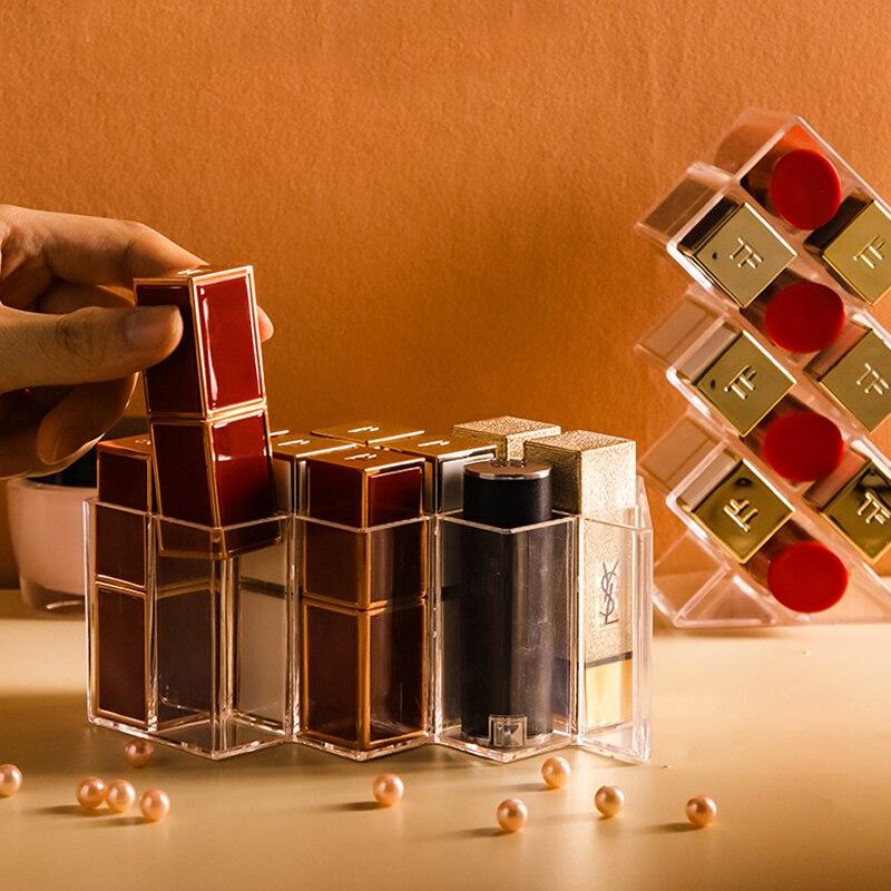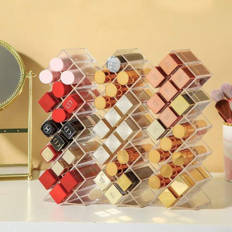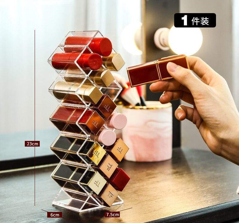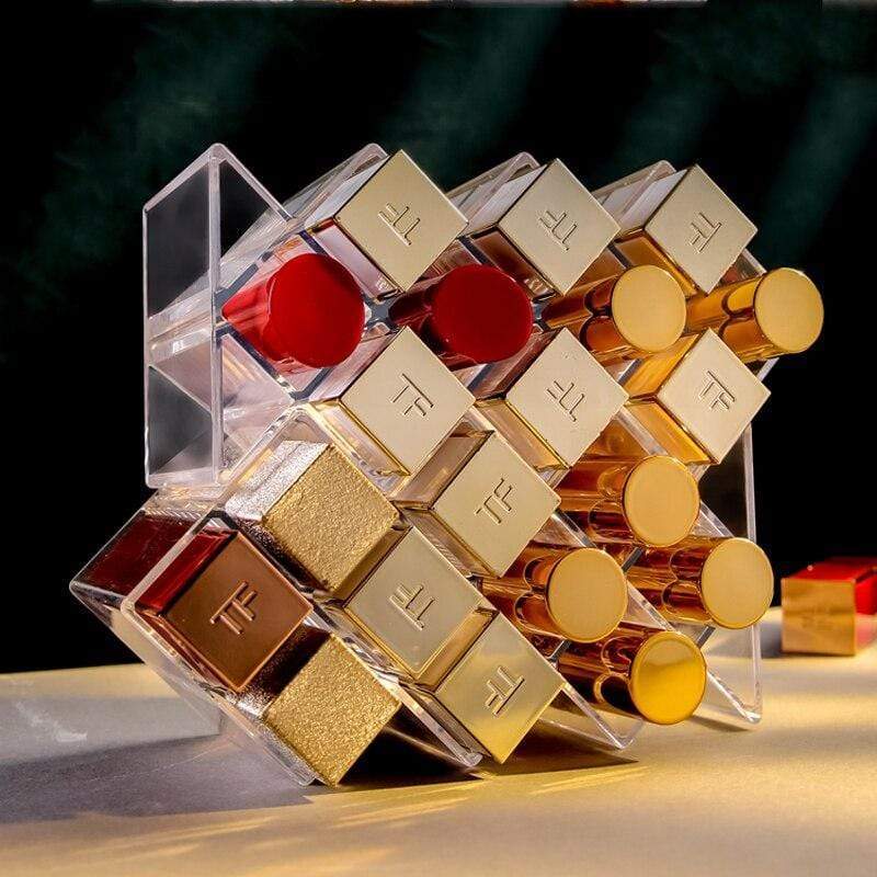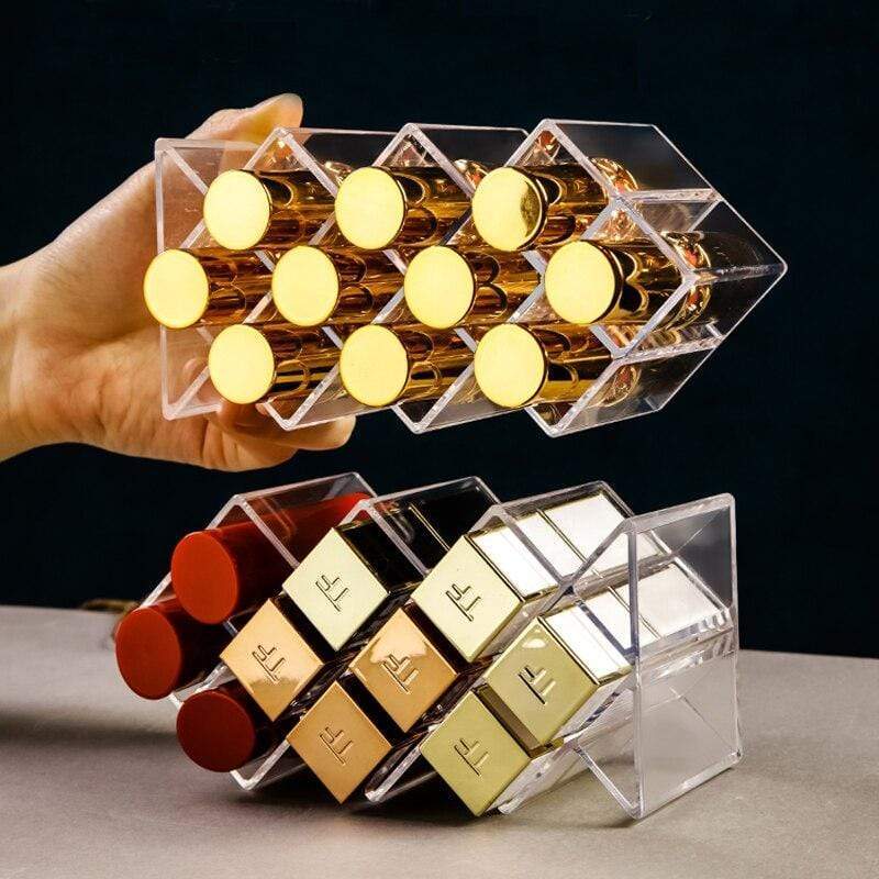 En genomskinlig plastställ, perfekt för att enkelt organisera dina läppstift. Finns i konfigurationer med 10 eller 16 fack, vilket gör att du kan förvara hela din samling av läppstift med stil.