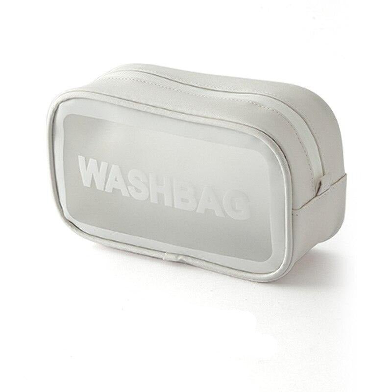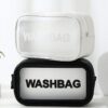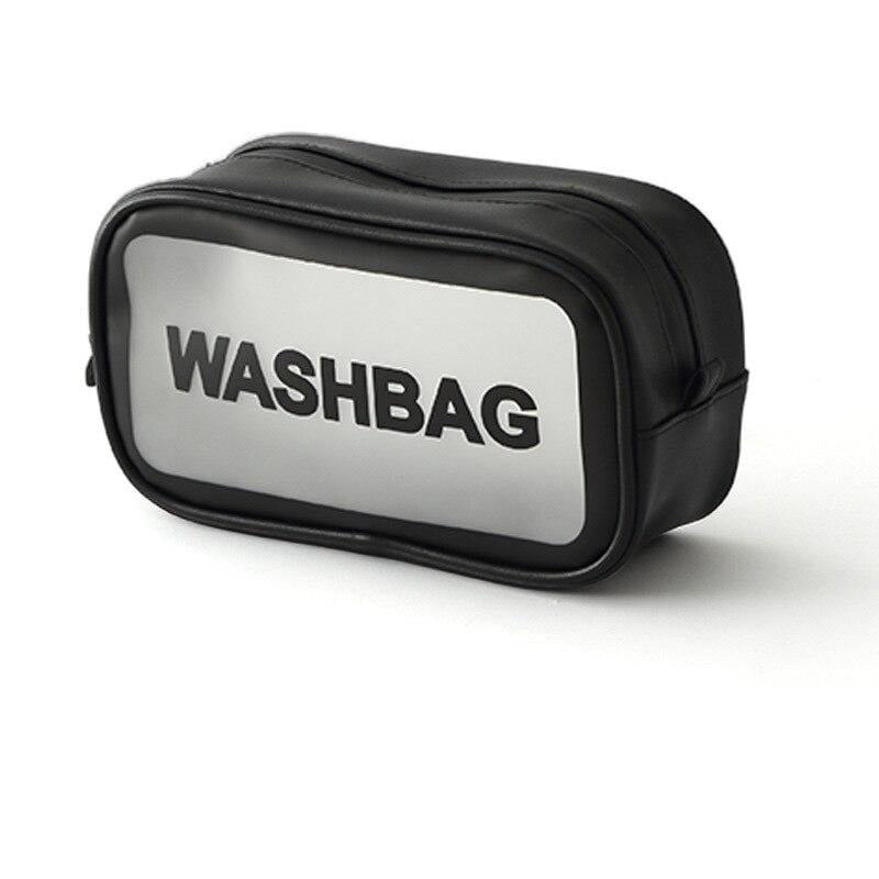 Den transparenta washbag necessären är utformad som en rektangulär block med flera rymliga fack för att rymma alla dina toalettartiklar. Denna modell är lämplig för både män och kvinnor. Tillverkad av transparent PVC och slätt, vattenavvisande tyg, finns den i olika varianter beroende på vilken modell du väljer. Detta tillbehör är perfekt för att transportera toalettartiklar, kosmetika, etc., under dina resor. Tack vare sin vattentäta dragkedja finns det ingen tvekan om dess vattentålighet. Tillgängliga färger är främst helt vitt eller svart med vita detaljer, med texten ”washbag” i svart i mitten.