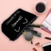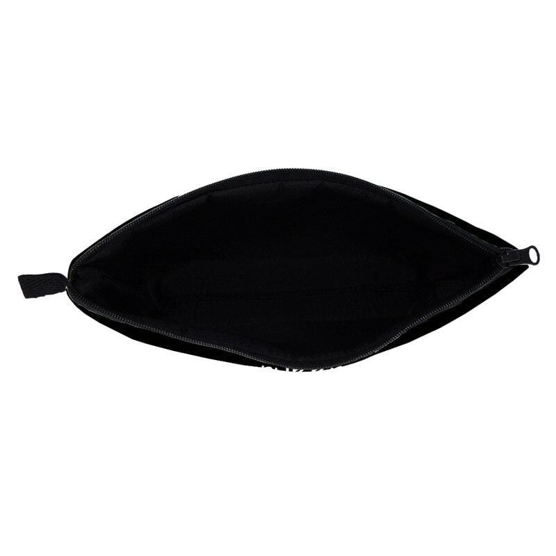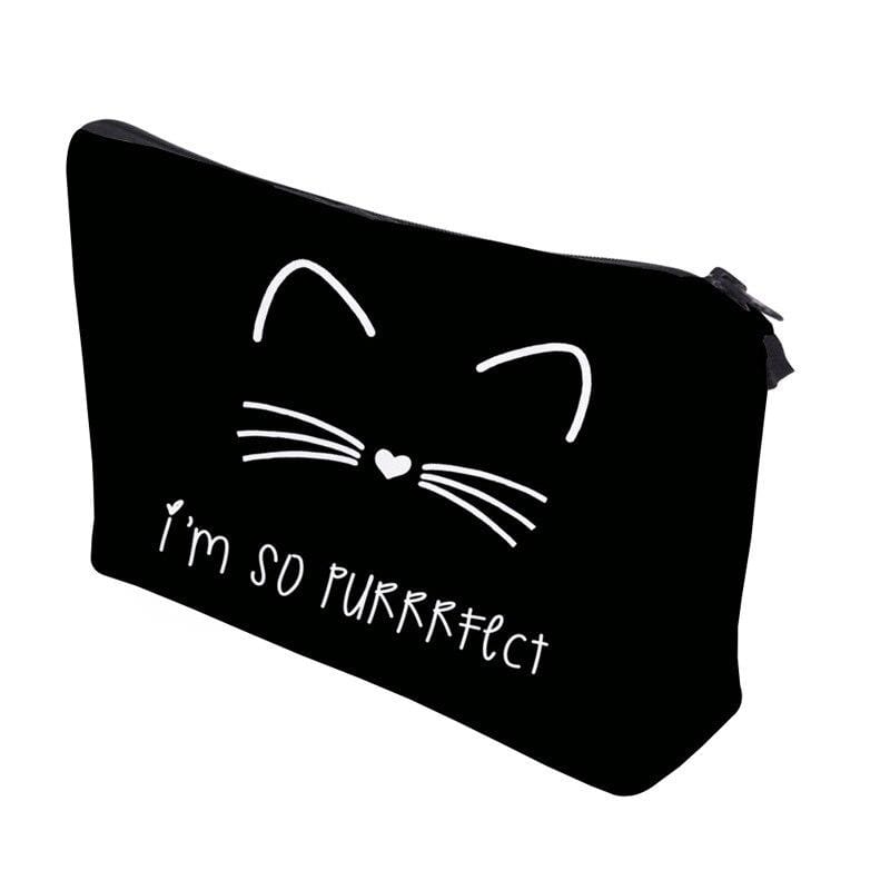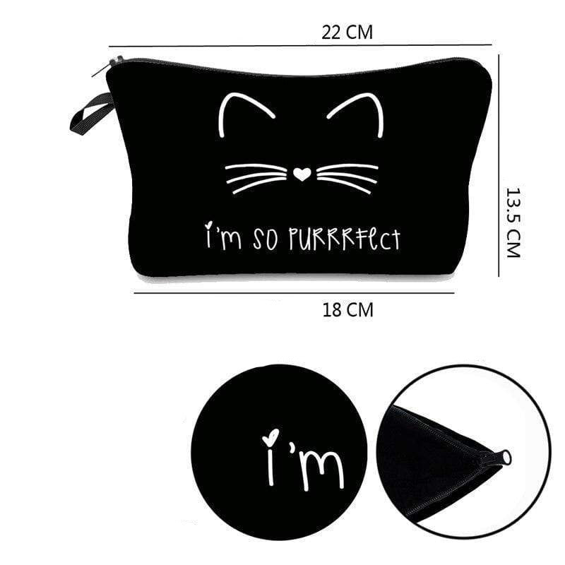 Sminkväskan med kattmotiv har samma traditionella funktion som andra necessärer, nämligen att fungera som en plats för förvaring av kosmetiska produkter. Denna väska är en underbar sak för dem som älskar katter som husdjur. När du ser denna necessär, ger den dig omedelbart en bild av en katt. Den finns tillgänglig i svart. Denna necessär är också mycket lätt att bära tack vare sin storlek. Den har en dragkedja som gör att du kan öppna den och förvara dina produkter inuti.