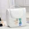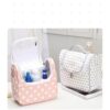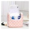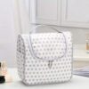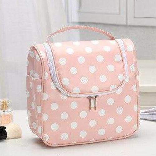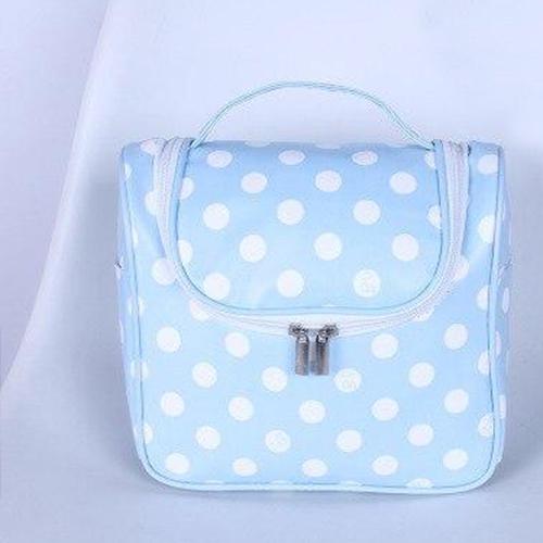 Tillgänglig i olika färger: vit beströdd med små stjärnor eller med en diskret teckning, blå med små vita prickar och rosa, du kan förvara allt ditt smink, krämer, parfym och andra kosmetiska produkter på ett säkert sätt eftersom den är helt vattentät.