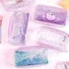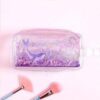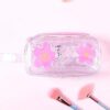 Sminkväska liten flicka har en rektangulär prismatform. Den innehåller genomskinliga pennor med glitter, läppolja och borstar. Här är dess mått: