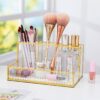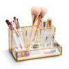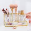 Letar du efter ett elegant och effektivt sätt att organisera ditt smink? Leta inte längre än denna sminkförvaring i glas! Den har tre nivåer av förvaring samt ett stort frontfack, vilket gör den till det perfekta sättet att förvara alla dina produkter på ett ställe. Dessutom ger guldramarna en touch av lyx till ditt sminkbord.