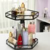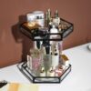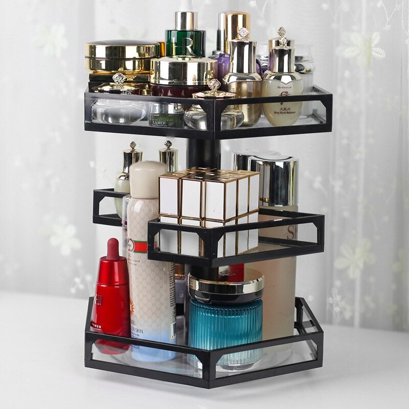 Designad i metall och glas, denna trevåningstorn är idealisk för att förvara alla dina skönhetsprodukter. Det genomskinliga glaset gör det enkelt att hitta dina artiklar, medan den roterande mekanismen ger enkel och snabb tillgång till var och en av dem.