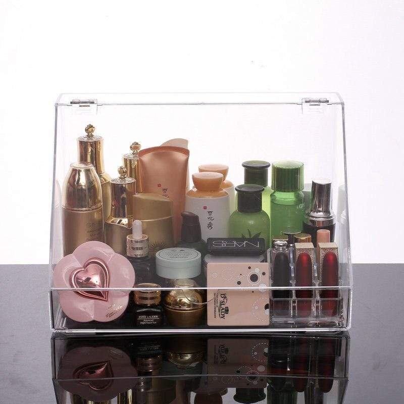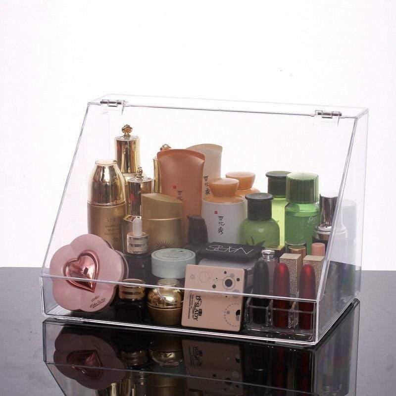 En stor akryl sminkförvaringslåda med ett lock för att skydda organisatören från fukt. Således kan du förvara hela din sminksamling säkert.