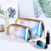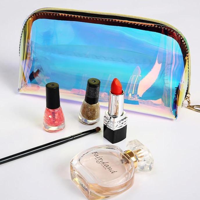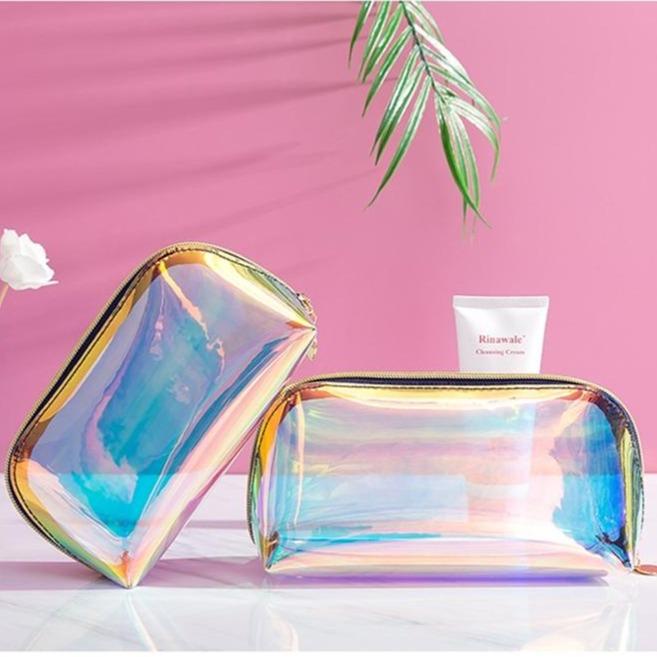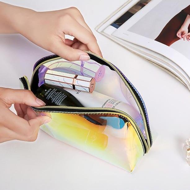 Gå inte hemifrån utan den! Välj denna transparenta flerfärgade sminkväska under dina resor, perfekt för dina kosmetika och säkerhetskontroller på flygplatsen.